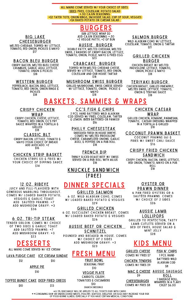 Big Lake Bar & Grill offers a varied menu that caters to diverse tastes. Starting with breakfast, the Big Lake Breakfast and Eggs Benedict provide hearty morning options. For lunch, a selection of burgers like the Big Lake Cheeseburger and Aussie Burger satisfies cravings.