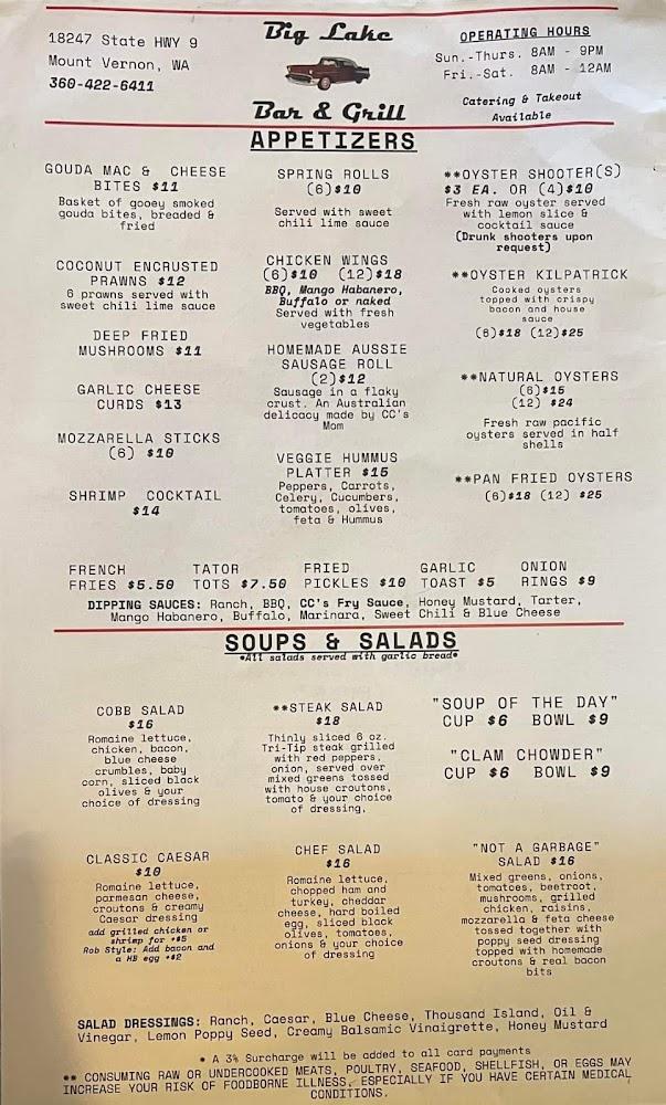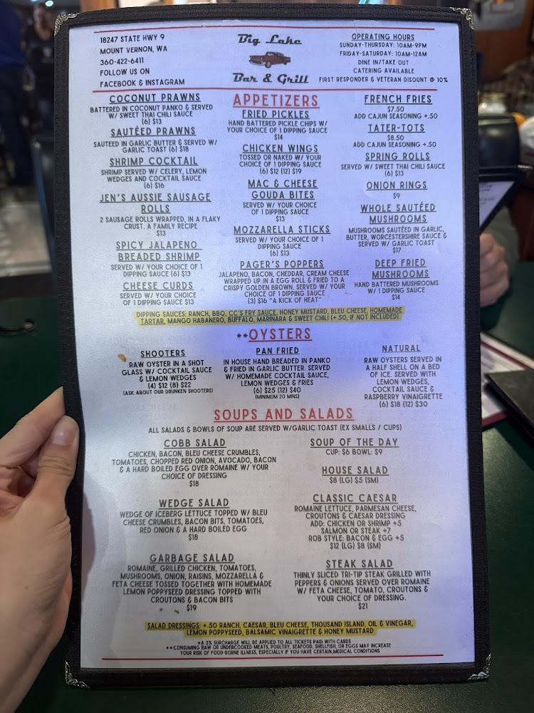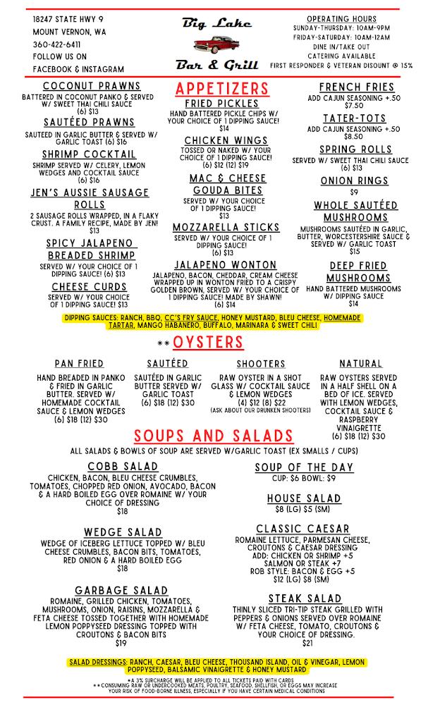 Welcome to Big Lake Bar & Grill, your go-to local spot on State Route 9, offering stunning views of Big Lake. Dive into our old-school ambiance while enjoying trivia nights, karaoke, and live music. With 10 beers on tap and a wide selection of mouthwatering dishes including burgers, salads, and breakfast favorites, there’s something for everyone. Our multiple flat-screen TVs ensure you won't miss a moment of the game. Whether you're dining in, grabbing takeout, or enjoying our outdoor patio, Big Lake Bar & Grill promises great food, fast service, and a lively atmosphere for all!